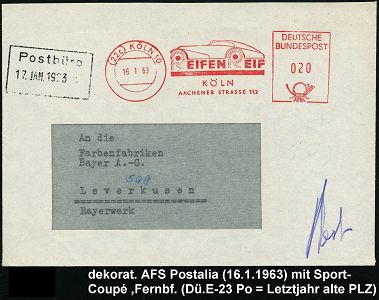 9294 | 15 € | 5000 KÖLN (Absender-Freistempel) : (22c) KÖLN 10/ REIFEN REIF.. 1963 (16.1.) dekorativer AFS Postalia = Sportwagen-Reifen , Fern-Bf. klar! (Dü.E-23 B) | ![]() ![]() | |