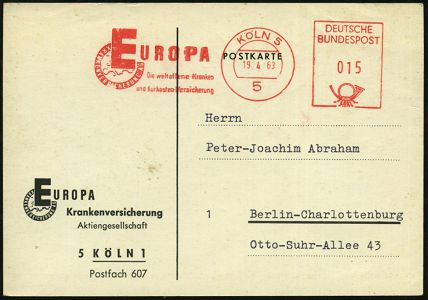 9295 | 14 € | 5000 KÖLN (Absender-Freistempel) : 5 KÖLN 5/ EUROPA/ KRANKENVERSICHERUNG AG.. 1963 (19.4.) AFS Postalia (gr. "E" vor Europakarte) motivgl. Firmen-Kt. (Dü.E-26 B) | ![]() ![]() | |