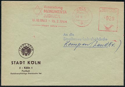 9297 | 20 € | 5000 KÖLN (Absender-Freistempel) : 5 KÖLN 1/ Ausstellung/ MONUMENTA/ JUDAICA../ STADT KÖLN 1964 (6.1.) seltener AFS Francotyp = Davidstern (AFS wie meist etw. abgenutzt) Kommunal-Bf., rs. Werbung, nur kurze Verwendungszeit! (Dü.E-26) | ![]() ![]() | |