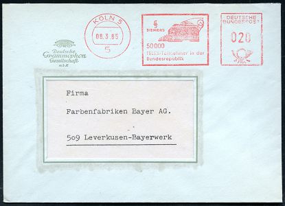 9298 | 16 € | 5000 KÖLN (Absender-Freistempel) : 5 KÖLN 5/ SH/ SIEMENS/ 50 000/ TELEX-Teilnehmer.. 1965 AFS Francotyp (= Fernschreiber !) Firmen-Bf.: Deutsche Grammophon GmbH, seltenes Motiv! (Dü.E-23CO) | ![]() | |