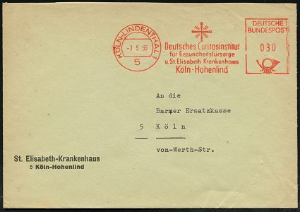 9301 | 15 € | 5000 KÖLN (Absender-Freistempel) : 5 KÖLN-LINDENTHAL 1/ Deutsches Caritasinstitut/ für Gesundheitsfürsorge/ u.St.Elisabeth-Krankenhaus 1966 (3.5.) AFS Postalia (Strahlen-Kreuz) auf Firmen-Bf.: St. Elisabeth-Krankenhaus..Hohenlind (Dü.E-23 B) | ![]() ![]() | |