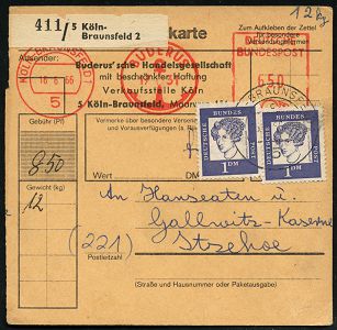 9302 | 20 € | 5000 KÖLN (Absender-Freistempel) : 5 KÖLN-BRAUNSFELD 1/ BUDERUS 1966 (18.6.) AFS Postalia 650 Pf. + Zusatzfrank. 2x 1 Mk. Droste-Hülshoff (Mi.361, MeF, + 10.-EUR) 1K-Segment: 5 KÖLN-BRAUNSFELD/c auf MiF-Inl.-Paketkarte n. Itzehoe.MiF-Inl.- (Dü.E-23 B + 2x Mi. 361) | ![]() ![]() | |
