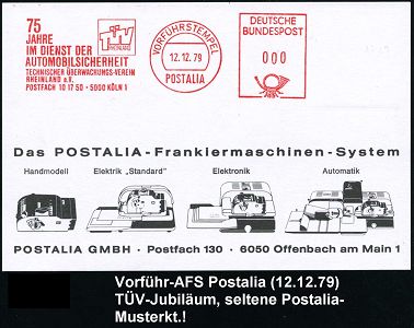 9308 | 16 € | 5000 KÖLN (Absender-Freistempel) : 5000 Köln 1 1979 (12.12.) AFS: VORFÜHRSTEMPEL/POSTALIA/TÜV/75 JAHRE/IM DIENST DER/ AUTOMOBILSICHERHEIT.., seltene Postalia-Musterkarte, vergl. Kat.-Nr. 9310 (= Specimen) | ![]() | |