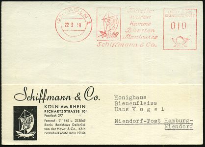 9288 | 14 € | 5000 KÖLN (Absender-Freistempel) : (22c) KÖLN 1/ Toilette-/ waren/ Kämme/ Bürsten/ Manicures/ Schiffmann & Co 1958 (17.9.) AFS Francotyp (Logo: Segelschiff) motivgl. Firmen-Kt. (Dü.E-23CG) | ![]() | |