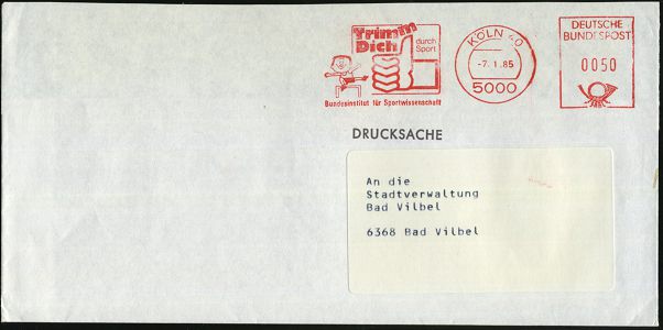 9315 | 12 € | 5000 KÖLN (Absender-Freistempel) : 5000 KÖLN 40/ Trimm/ Dich/ durch Sport/ Bundesinstitut für Sportwissenschaft 1985 (7.1.) AFS Postalia = Comic-Trimm-Figur (u. Hand mit erhobenen Daumen) Fernbf. (Dü.E-26B) | ![]() ![]() | |
