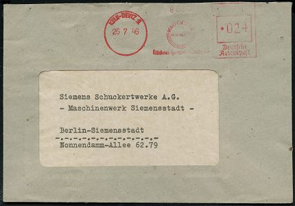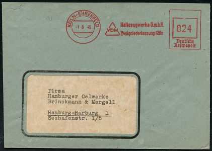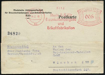 9274 | 28 € | 5000 KÖLN (Absender-Freistempel) : KÖLN/ 16/ Rhein A.-G. für/ Braunkohlenbergbau/ und/ Brikettfabrikation 1946 (14.2.) AFS Francotyp "Bogenrechteck" unverändert weiterverwendet mit Inschrift "DEUTSCHES REICH" = Notmaßnahme! , Firmen-Kt. n. München (Dü.E-1CAh, unverändert) | ![]() | |
