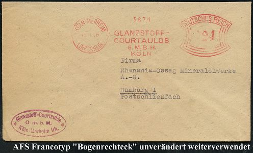 9266 | 28 € | 5000 KÖLN (Absender-Freistempel) : KÖLN-MERHEIM/ LINKSRHEIN/ GLANZSTOFF-/ COUTAULDS/ GMBH.. 1946 (10.11.) AFS Francotyp "Bogenrechteck" unverändert mit Inschrift "DEUTSCHES REICH" weiterverwendet = Notmaßnahme! , Fern-Bf. (Dü.E-1BAh, unverändert) | ![]() | |