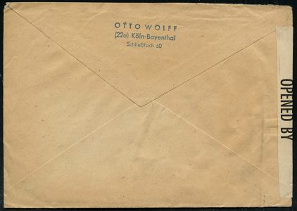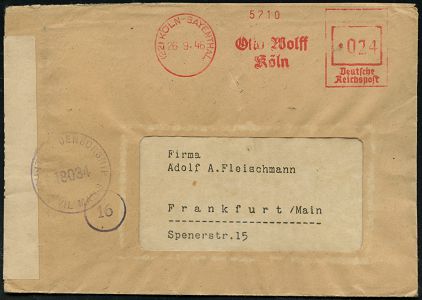 9267 | 30 € | 5000 KÖLN (Absender-Freistempel) : (22) KÖLN-BAYENTHAL/ Otto Wolff.. 1946 (26.9.) aptierter AFS Francotyp "Reichsadler" = entfernt = Notmaßnahme! = Metall- u. Stahl-Firma, rs. Abs.-3L + viol. alliierter 1K-Zensur: MILITARY CENSORSHIP/18034/ CIVIL MAILS + weißer Zensurstreifen: OPENED BY ohne Druckvermerk! (= Bonn, Rie.B-5, B-103), Inl.-Zensur-Bf. (Dü.E-13 J-147h) | ![]() ![]() | |