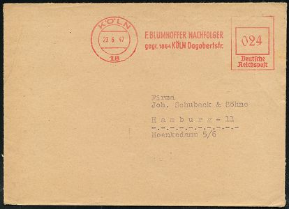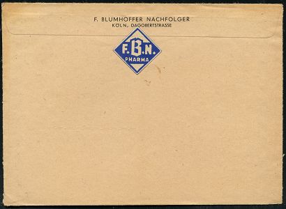 9269 | 25 € | 5000 KÖLN (Absender-Freistempel) : KÖLN/ 18/ F.BLUMENHOFFER NACHFOLGER/ gegr.1864.. 1947 (23.6.) aptierter AFS Francotyp "Reichsadler" = entfernt = Notmaßnahme! , rs. Abs.-Vordruck + blaue Rhombus-Vignette: F. B. N. PHARMA, Fern-Bf. (Dü.E-13 J-127o) | ![]() ![]() | |