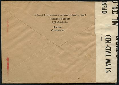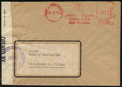 9275 | 30 € | 5000 KÖLN (Absender-Freistempel) : KÖLN-MÜLHEIM 1/ NEPTUN/ Felten & Guilleaume/ Carlswerk AG.. 1946 (20.2.) aptierter AFS Francotyp "Reichsadler" = entfernt = Notmaßnahme! (Firmenlogo: Neptuns Dreizack) + britischer Zensur-1K: MILITARY CENSORSHIP/18148/ CIVIL MAILS + Zensurzettel: OPENED BY/CEN.-CIVIL MAILS (PSS.2411 8.45) = Bonn (Rie.B-5, A-100 + 50 Pkte.) Inl.-Zensur-Bf. (Dü.E-13 J-147o) | ![]() ![]() | |