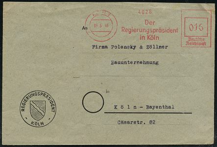 9276 | 25 € | 5000 KÖLN (Absender-Freistempel) : KÖLN 1/ Der/ Regierungspräsidet/ in Köln 1946 (6.5.) aptierter AFS Francotyp "Reichsadler" = entfernt = Notmaßnahme! , Orts-Dienst-Bf. m. Wappen (Dü.E-13 J-127h) | ![]() | |