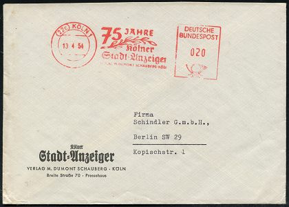 9283 | 16 € | 5000 KÖLN (Absender-Freistempel) : (22c) KÖLN 1/ 75 JAHRE/ Kölner/ Stadt-Anzeiger.. 1954 (13.4.) Jubil.-AFS Postalia (Lorbeer) auf notopfer-befreitem Firmen-Bf. n. West-Berlin (Dü.E-23 B) | ![]() ![]() | |
