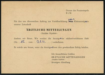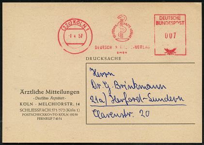 9285 | 12 € | 5000 KÖLN (Absender-Freistempel) : (22c) KÖLN 1/ DEUTSCHER ÄRZTE-VERLAG.. 1957 (1.4.) AFS Postalia (Äskulap-Stab mit Schlange) Firmen-Kt.: Ärztliche Mitteilungen, Deutsches Ärzteblatt.. (Dü.E-23 B) | ![]() ![]() ![]() | |