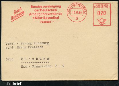 9304 | 10 € | 5000 KÖLN (Absender-Freistempel) : 5 KÖLNBAYENTHAL/ Bundesvereinigung/ der Deutschen/ Arbeitgeberverbände.. 1968 (10.10.) AFS mit Zusatz "Brief-/Drucksache" , Teil-Bf. (Dü.E-26) | ![]() | |