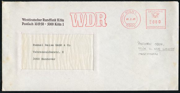 9311 | 15 € | 5000 KÖLN (Absender-Freistempel) : 5000 KÖLN 1/ W D R 1983 (18.2.) AFS Pitney-Bowes mit Posthorn o b e n ! = seltene Type! (nur wenige Maschinen) Dienst-Bf.: Westdeutscher Rundfunk Köln.. (Dü.E-26E Nr.299) | ![]() | |