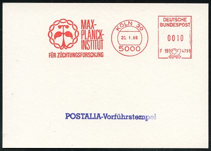9316 | 15 € | 5000 KÖLN (Absender-Freistempel) : 5000 KÖLN 30/ F19 4793/ MAX-/ PLANCK-/ INSTITUT/ FÜR ZÜCHTUNGSFORSCHUNG 1986 (20.1.) AFS-Musterabdruck Postalia vierstellig mit stilis. Posthorn u. Kennung (Pflanzen-Logo) seltene Postalia-Musterkarte (Dü.E-26 B) | ![]() ![]() | |