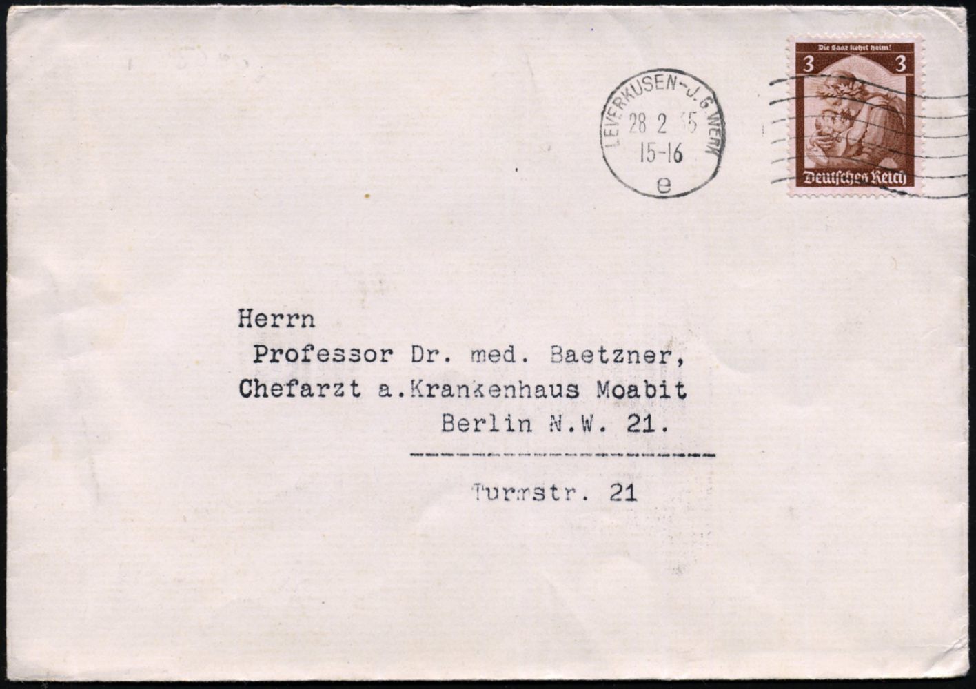 9455 | 20 € | 5090 LEVERKUSEN (Allgem. Abteilung, Sonder- und Maschinenstempel) : LEVERKUSEN-J.G. WERK/ e 1935 (28.2.) MaWellenSt (6 Wellen rechts) = Hauspostamt I.G.-Werk Bayer (Pharma-Werke "Bayer-Leverkusen") seltene Inl.-Drs-Bf. (Mi.565) | ![]() | |