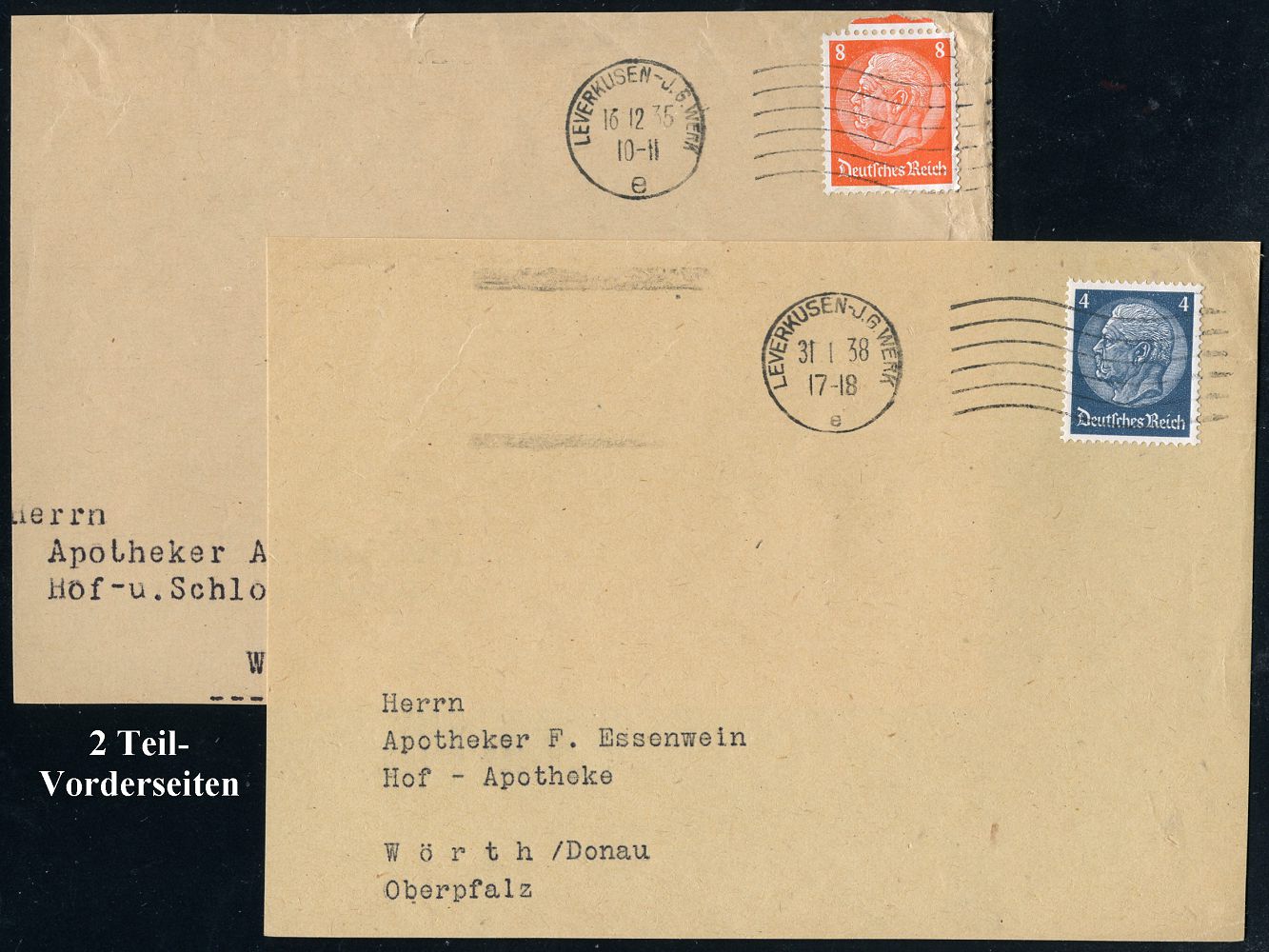 9457 | 28 € | 5090 LEVERKUSEN (Allgem. Abteilung, Sonder- und Maschinenstempel) : LEVERKUSEN-J.G. WERK/ e 1935/38 2 verschied.MaWellenSt mit großem UB "e" und kleinem UB "e" = Hauspostamt je klar auf Teil-Vorderseite (Einzelverkauf möglich: je 15.- EUR), 2 Belege | ![]() | |