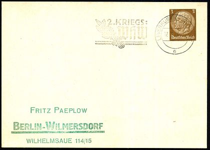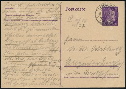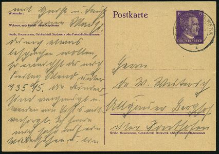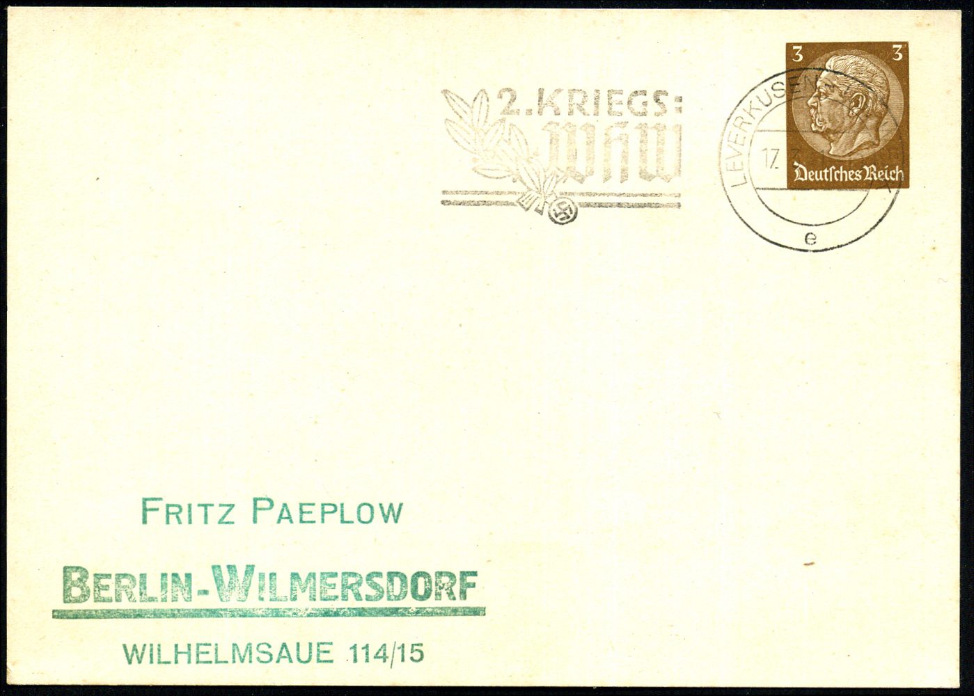 9458 | 30 € | 5090 LEVERKUSEN (Allgem. Abteilung, Sonder- und Maschinenstempel) : LEVERKUSEN - I.G. WERK/ e/ 2.KRIEGS-/ WHW 1941 (17.3.) seltener MWSt = Hauspostamt I.G.-Bayerwerk (Hakenkreuz-Schwert mit Lorbeer) auf PP 3 Pf. Hindenbg. (blanco, Frech.PP 121/A 1) Inl.-Karte (Bo.S 368 A, nur 5 1/2 Monate verwendet) | ![]() | |
