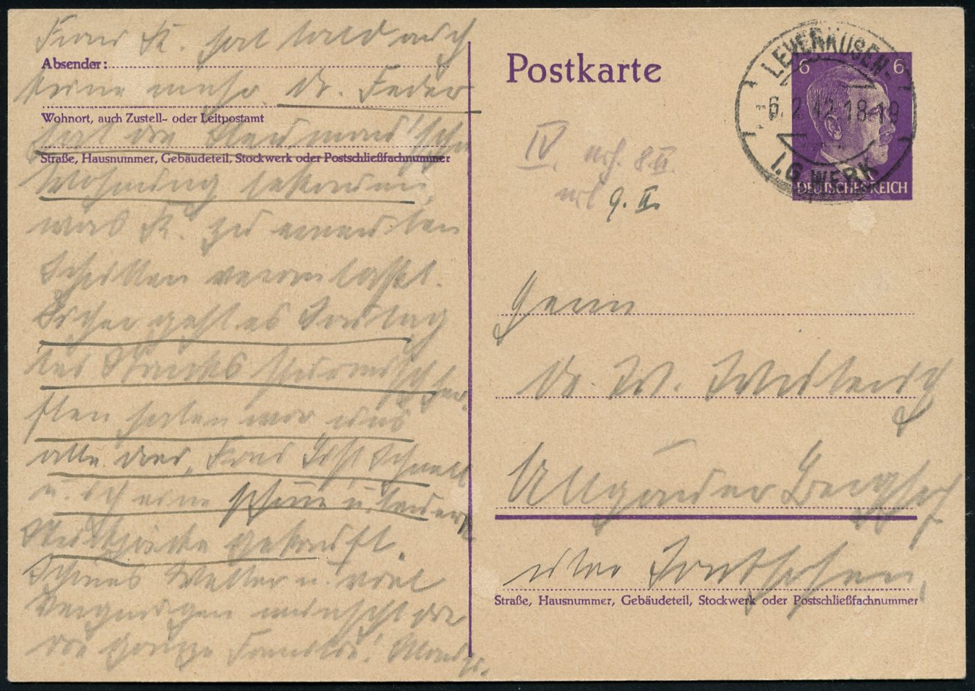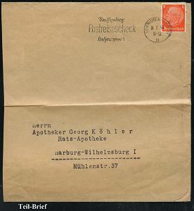 9462 | 18 € | 5090 LEVERKUSEN (Allgem. Abteilung, Sonder- und Maschinenstempel) : LEVERKUSEN-/ a/ I.G. WERK 1942 (11.2.) 2K-Steg = Hauspostamt Bayer-Werke mit UB "a" klar auf Inl.-P 6 Pf. Hitler, Bedarf mit viel Text! (Mi.P 299) | ![]() | |