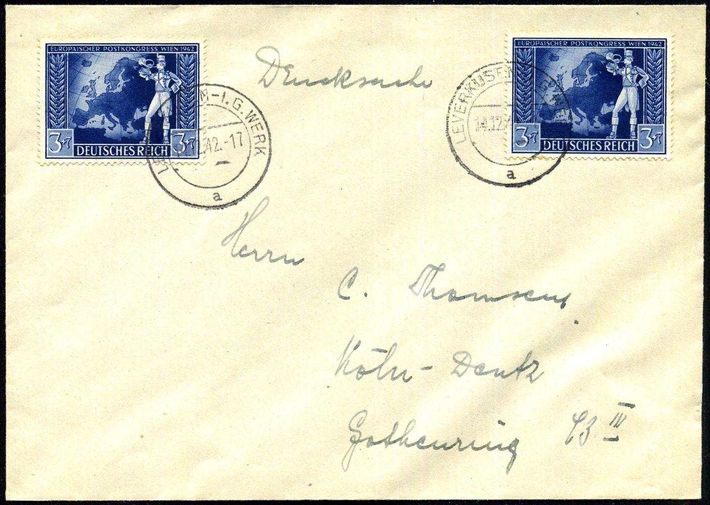 9463 | 20 € | 5090 LEVERKUSEN (Allgem. Abteilung, Sonder- und Maschinenstempel) : LEVERKUSEN-I.G.WERK/ a 1942 (14.12.) 2K-Steg = Hauspostamt Bayerwerk 2x auf 2x 3 Pf.+ 7 Pf. Europ. Postkonferenz , klar gest. Fern-Bf. (Mi.820 MeF) | ![]() | |