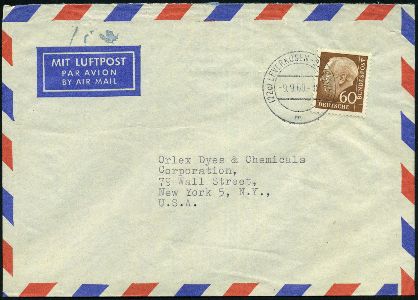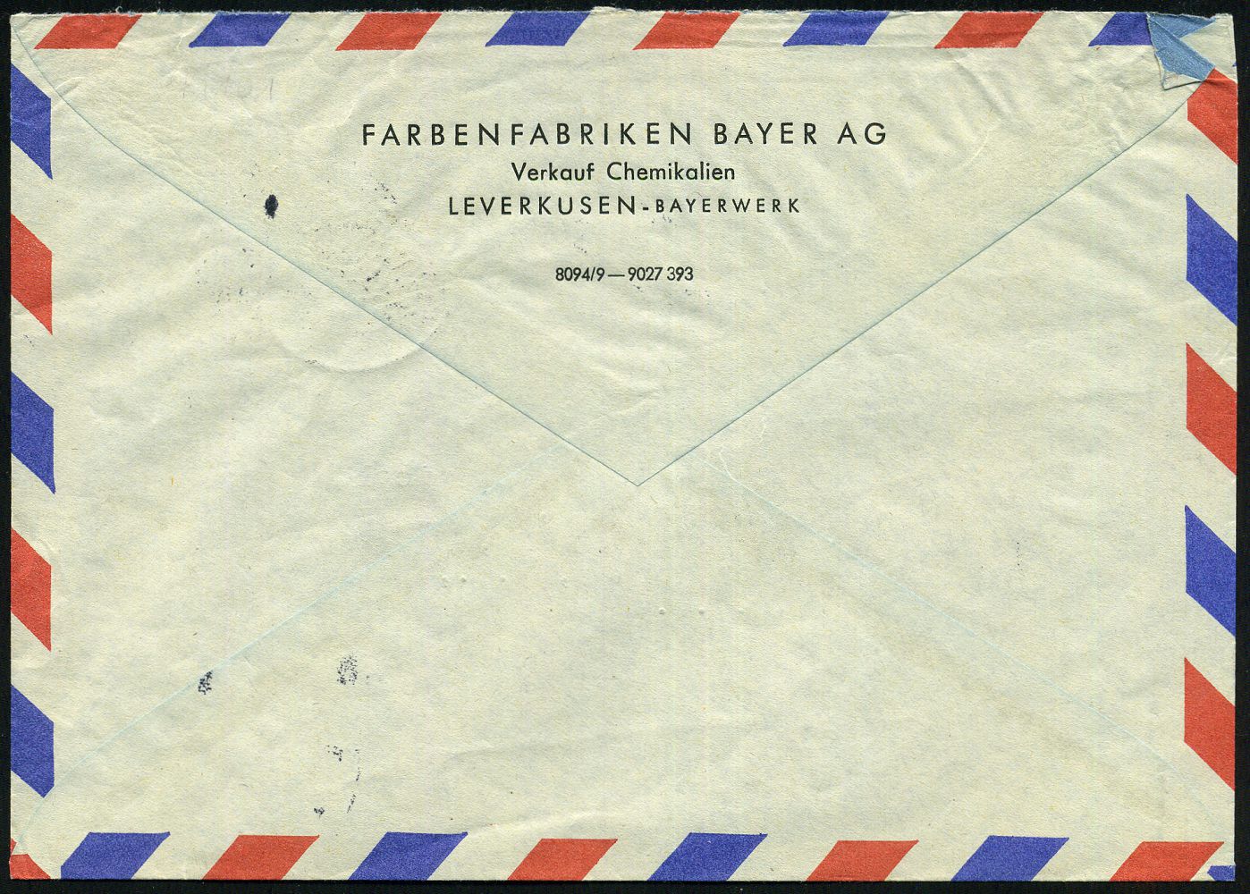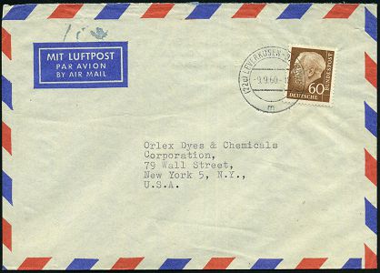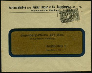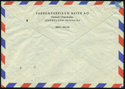 9465 | 18 € | 5090 LEVERKUSEN (Allgem. Abteilung, Sonder- und Maschinenstempel) : (22c) LEVERKUSEN-BAYERWERK/ m 1960 (9.6.) 2K-Steg = Hauspostamt auf EF 60 Pf. Heuss II, , rs. Abs.-Vordruck: FARBEN-FABRIKEN BAYER AG, Verkauf Chemikalien, Übersee-Flp.-Bf. n. New York (Mi.262 EF) | ![]() ![]() | |