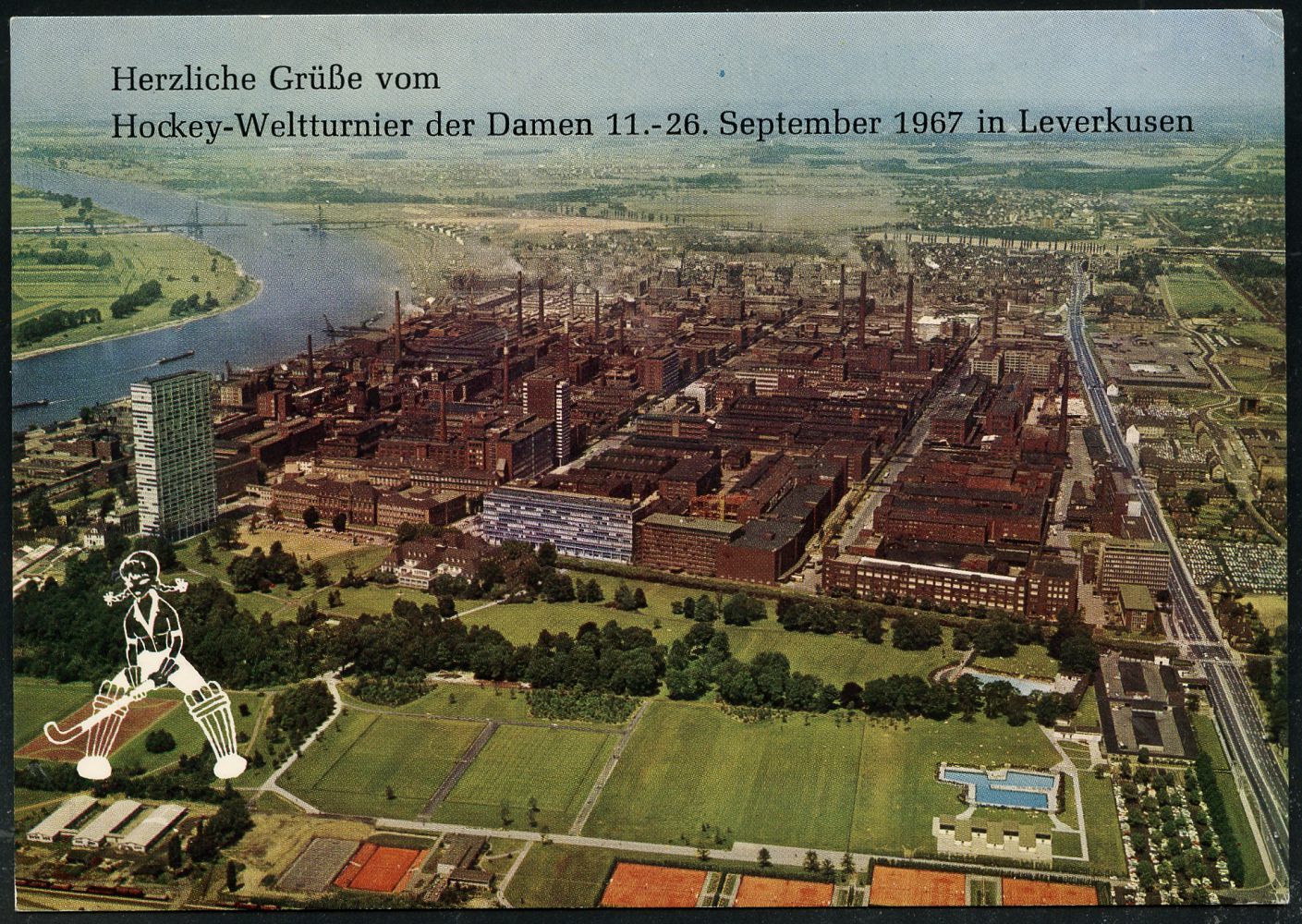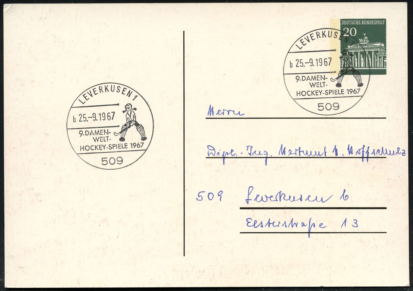 9468 | 16 € | 5090 LEVERKUSEN (Allgem. Abteilung, Sonder- und Maschinenstempel) : 509 LEVERKUSEN 1/ 9.DAMEN-/ WELT-/ HOCKEY-SPIELE/ b 1967 (25.9.) SSt = Feldhockey-Spielerin auf passender PP 20 Pf. Brandenbg. Tor grün: Hockey-Stadion, Logo u. Bayerwerk (Mi.PP 43/4) Inl.-Karte (Bo.8 b) | ![]() ![]() | |