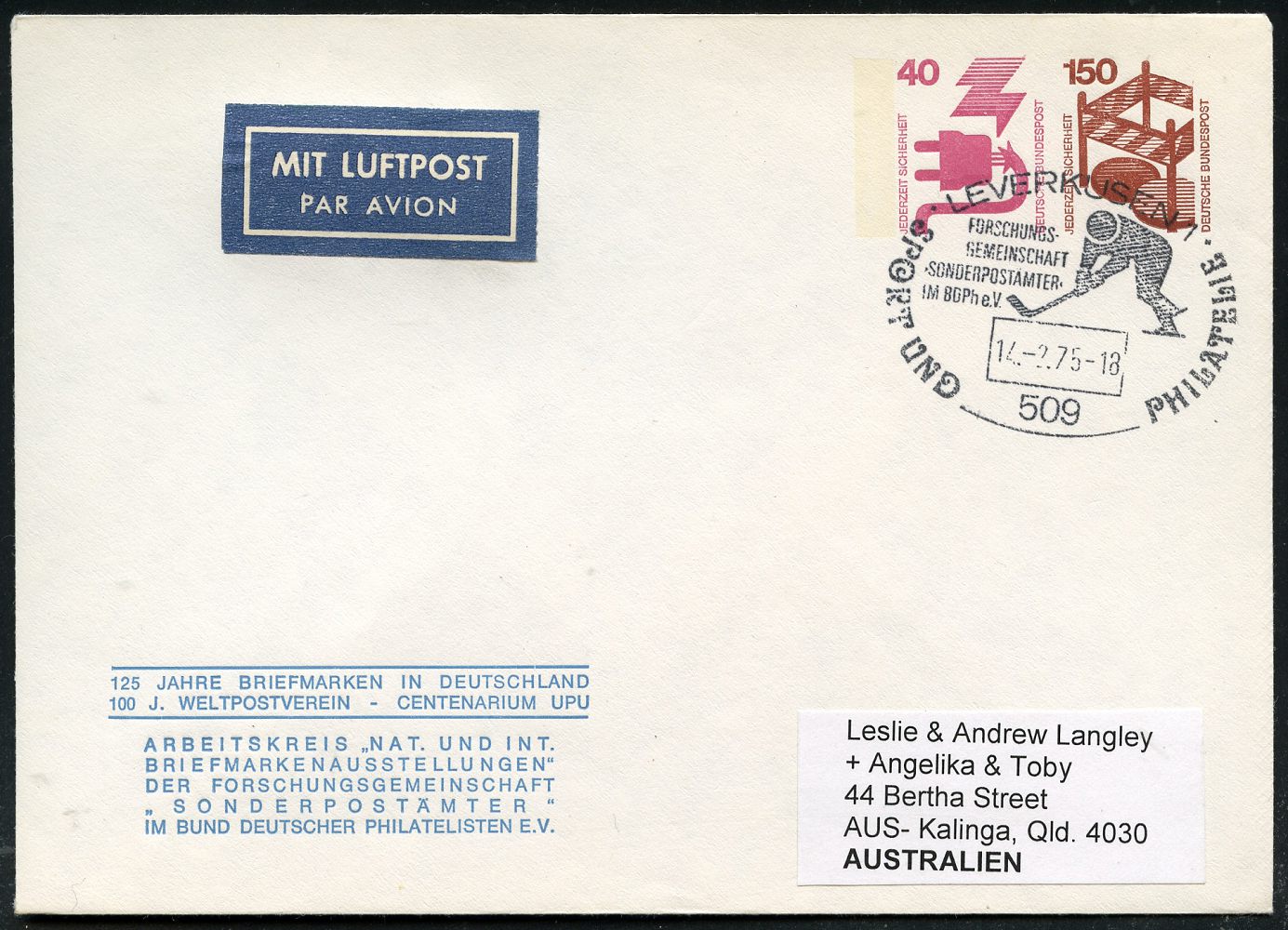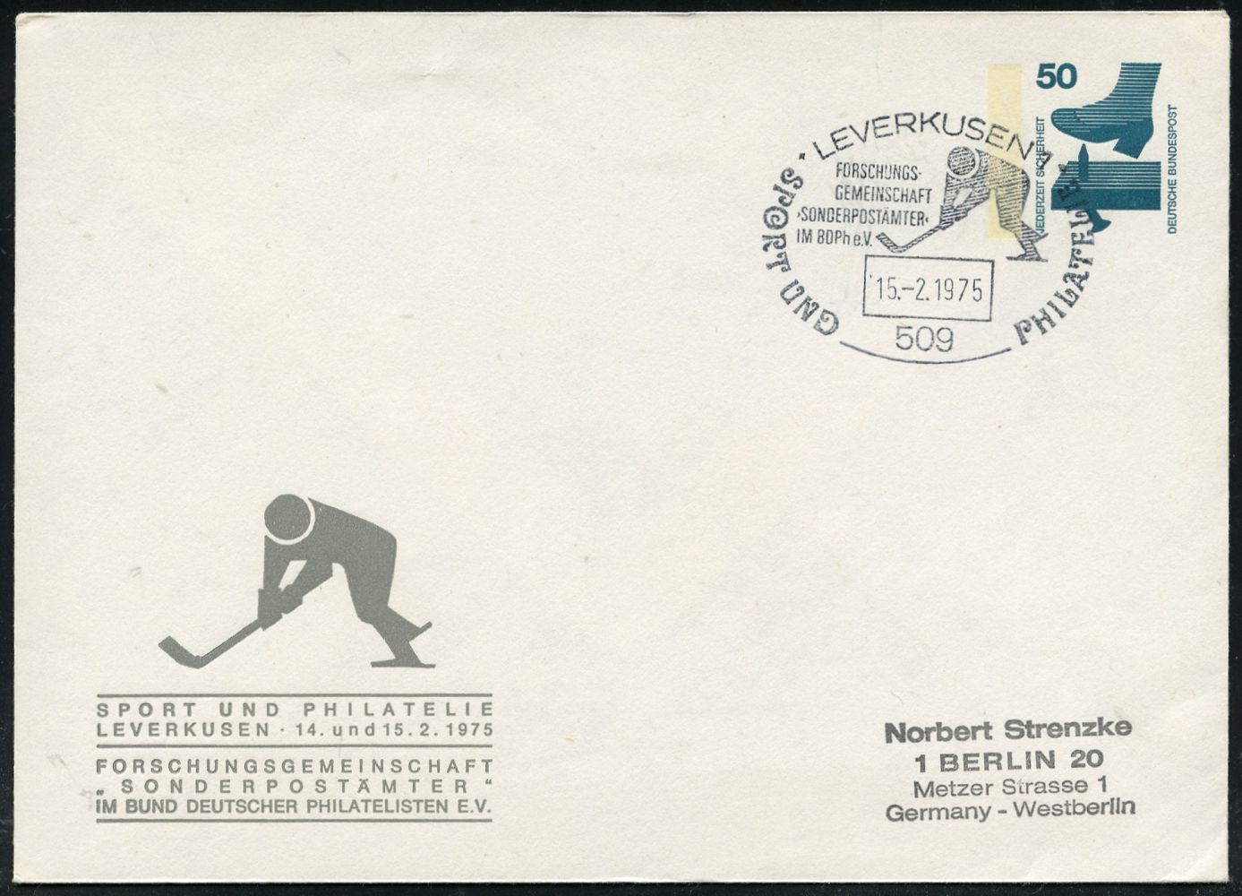 9471 | 18 € | 5090 LEVERKUSEN (Allgem. Abteilung, Sonder- und Maschinenstempel) : 509 LEVERKUSEN 1/ SPORT U.PHILATELIE 1975 (14.2.) SSt = Eishockey-Piktogramm auf PU 40 Pf. + 150 Pf. Unfall: 125 Jahre Briefmarken.., 100 J. Weltpostverein.. , klar gest. Übersee-Flp.-Bf. (Mi.PU 105) | ![]() | |