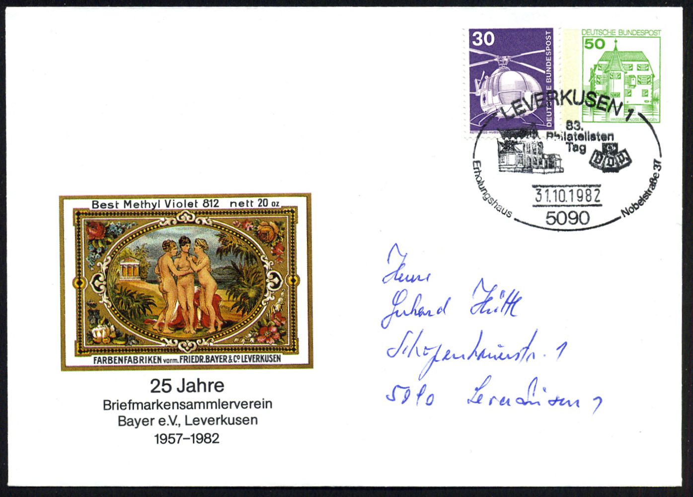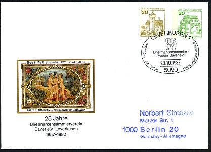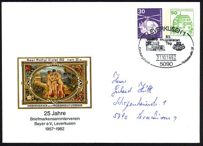 9475 | 22 € | 5090 LEVERKUSEN (Allgem. Abteilung, Sonder- und Maschinenstempel) : 5090 Leverkusen 1982 (28.10.) PU 50 Pf. Burgen, grün: 25 Jahre BSV Bayer e.V. = histor. Firmenetikett Farbenfabriken Friedr. Bayer (3 nackte Frauen vor Tempel) 2x + SSt.: 5090 LEVERKUSEN 1/25 Jahre BSV Bayer e.V. bzw. 5090 LEVERKUSEN 1/83. Philatelistentag (Einzelausruf möglich: je 12.- EUR) + Inhalt, 2 Belege (2x Mi.PU 113/53) | ![]() ![]() | |