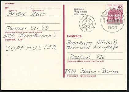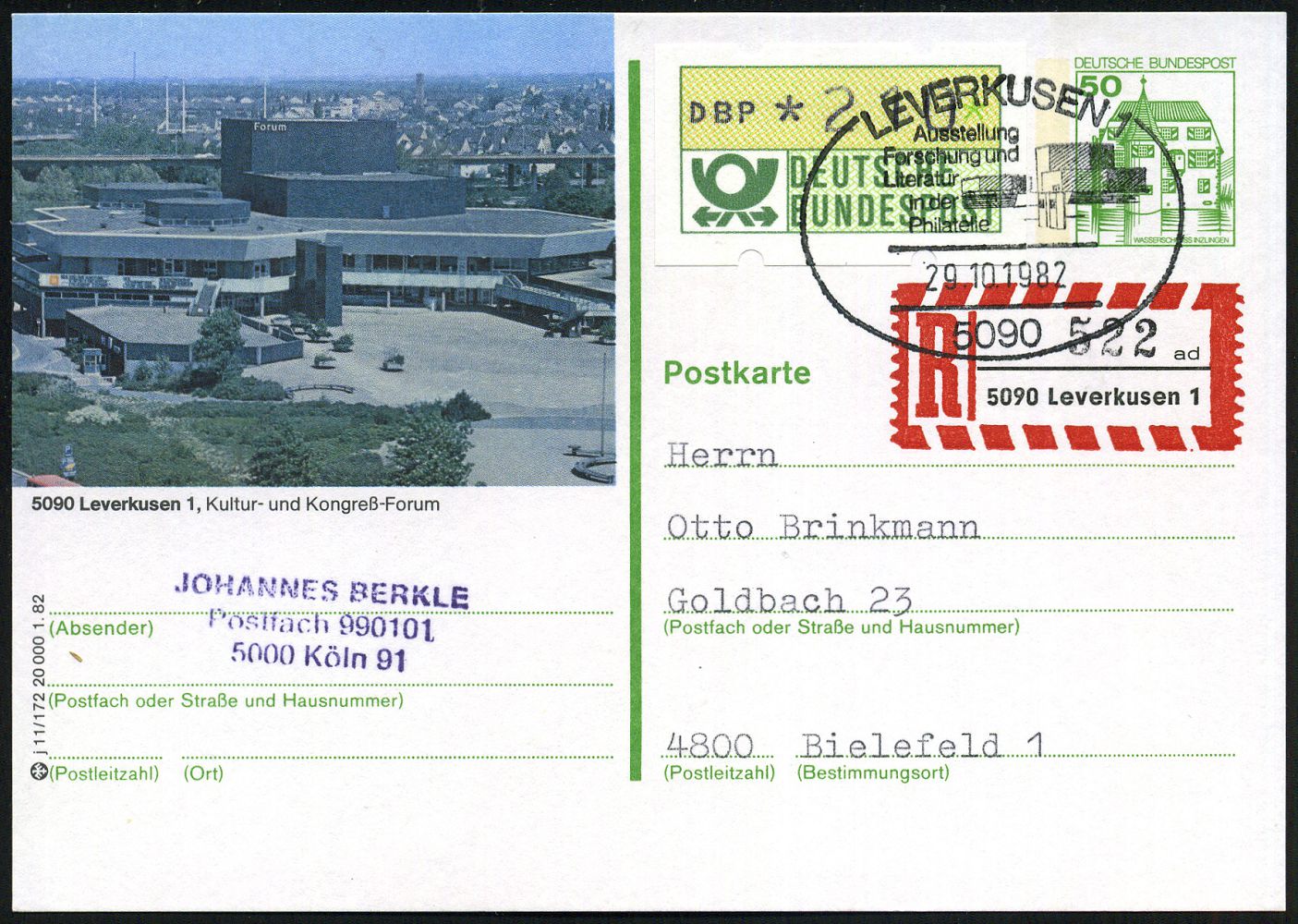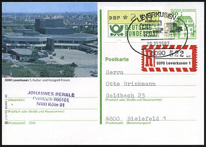 9476 | 18 € | 5090 LEVERKUSEN (Allgem. Abteilung, Sonder- und Maschinenstempel) : 5090 LEVERKUSEN 1/ Ausstellung/ Forschung u./ Literatur/ in der/ Philatelie 1982 (29.10.) SSt auf ortgl. BiP 50 Pf. Burgen, grün: 5090 Leverkusen Kongreß-Forum + eingedruckter Selbstbucher-RZ: 4090 Leverkusen 1/ a d + 210 Pf. ATM, Inl.-Selbstbucher-R-Karte (Mi.P 134 + ATM Mi.1) | ![]() | |