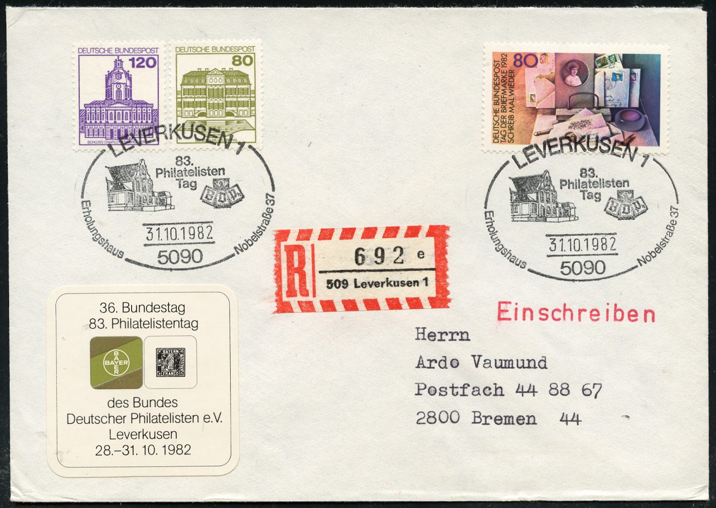 9477 | 16 € | 5090 LEVERKUSEN (Allgem. Abteilung, Sonder- und Maschinenstempel) : 5090 LEVERKUSEN 1/ 83./ Philatelisten/ Tag.. 1982 (31.10.) SSt auf 80 Pf. Tag d. Briefmarke (Mi.1154 u.a.) + Bayer-Vignette: 83.Philat.-Tag.., klar gest. Inl.-R-Bf. (Bo.54) | ![]() | |