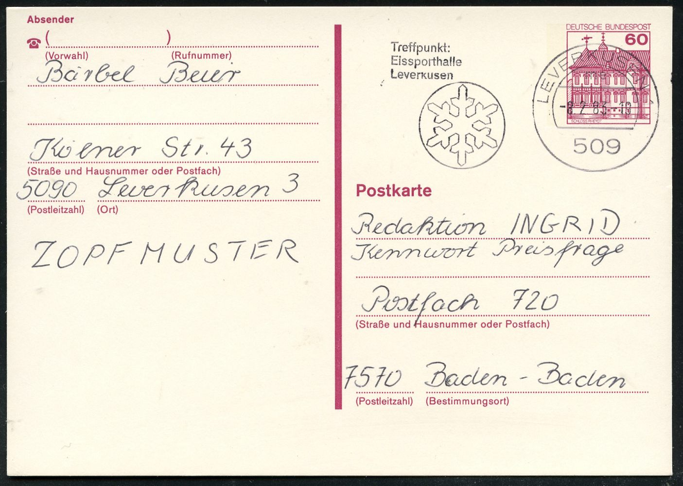 9478 | 6 € | 5090 LEVERKUSEN (Allgem. Abteilung, Sonder- und Maschinenstempel) : 509 LEVERKUSEN 1/ me/ Treffpunkt:/ Eissporthalle.. 1983 (8.2.) Saison-MWSt (Eiskristall) Bedarfs-Kt. | ![]() | |