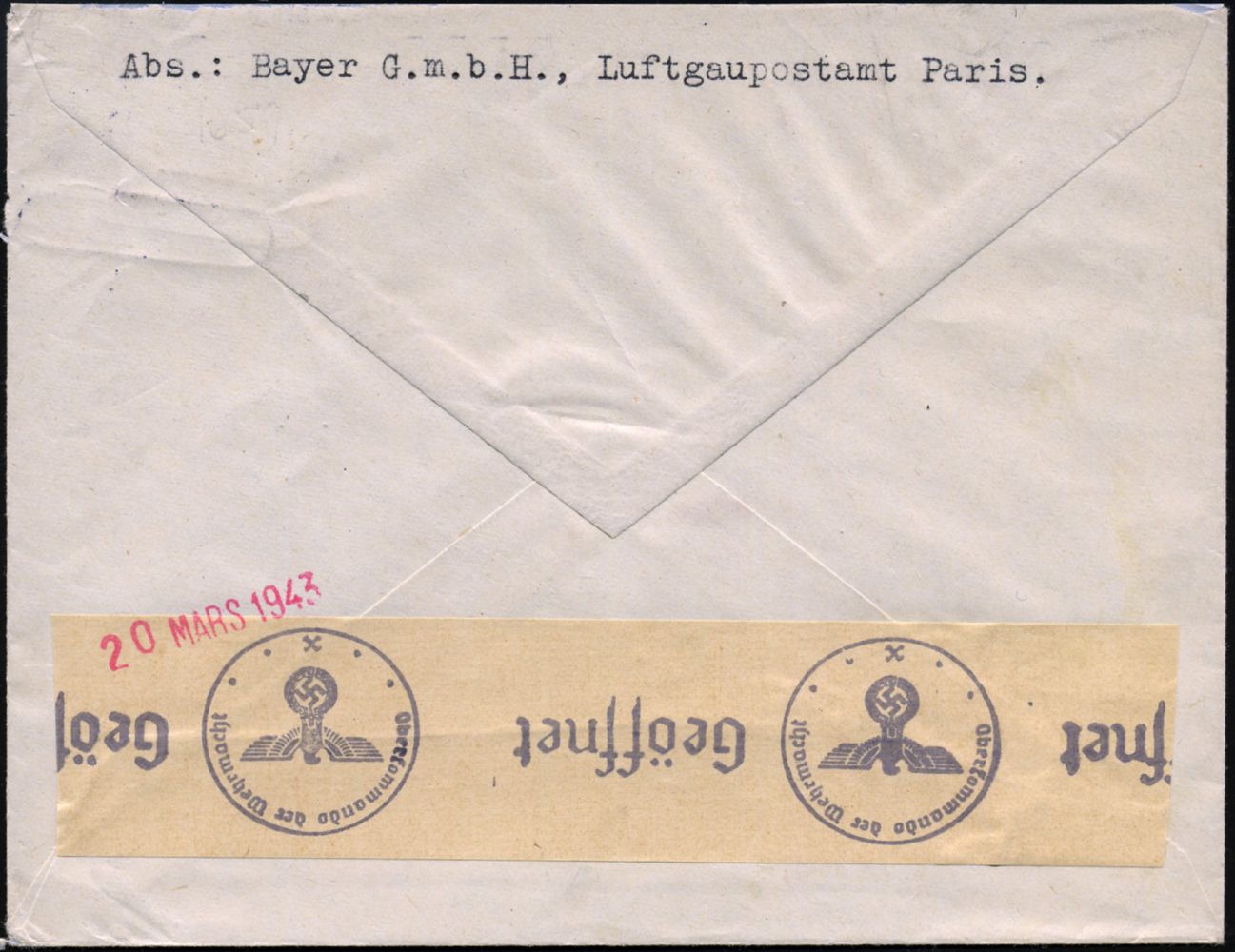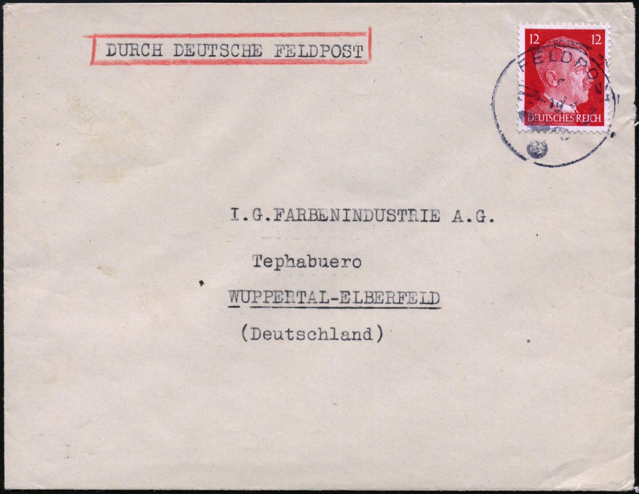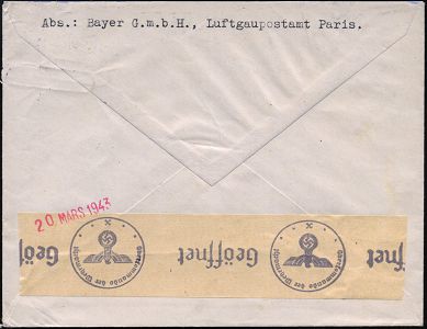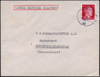 9480 | 35 € | 5090 LEVERKUSEN (Allgem. Abteilung, Sonder- und Maschinenstempel) : DEUTSCHE BES.FRANKREICH / Leverkusen 1943 (19.3.) 1K: FELDPOST auf EF 12 Pf.Hitler + Zusatz "DURCH DEUTSCHE FELDPOST" ,rs. sämischer OKW-Zensur-Streifen "x" = Paris + Datums-1L (Rie. X-50, + 50 Pkte.!) rs. Abs.: "Bayer" GmbH Paris an I.G. Farben Elberfeld! Zensur-Bf. im. Europa-Tarif = Inl.-Tarif via Feldpost! (Mi.827 EF = Europa-Tarif!) | ![]() ![]() | |