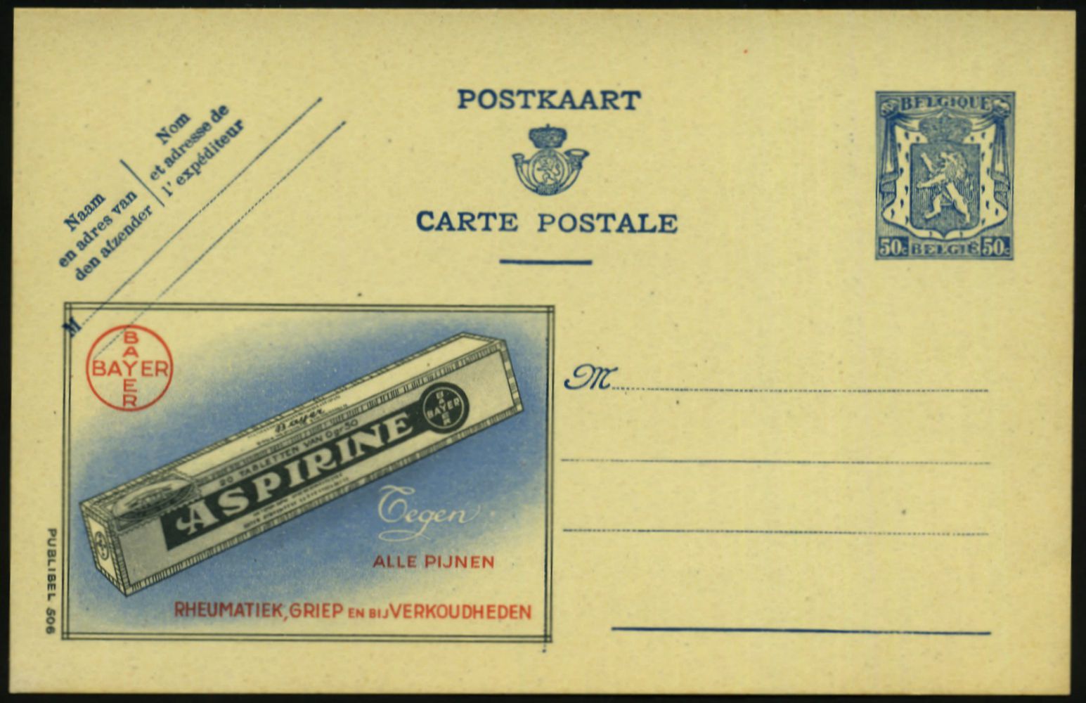 9481 | 18 € | 5090 LEVERKUSEN (Allgem. Abteilung, Sonder- und Maschinenstempel) : DEUTSCHE BES.BELGIEN 1941 50 C. Reklame-P. Wappenlöwe, blau: BAYER/ ASPIRINE Tegen ALLE PIJNEN / RHEUMATIEK, GRIEP.. (Packung) ungebr. (Mi.P 210 II / 506) | ![]() | |