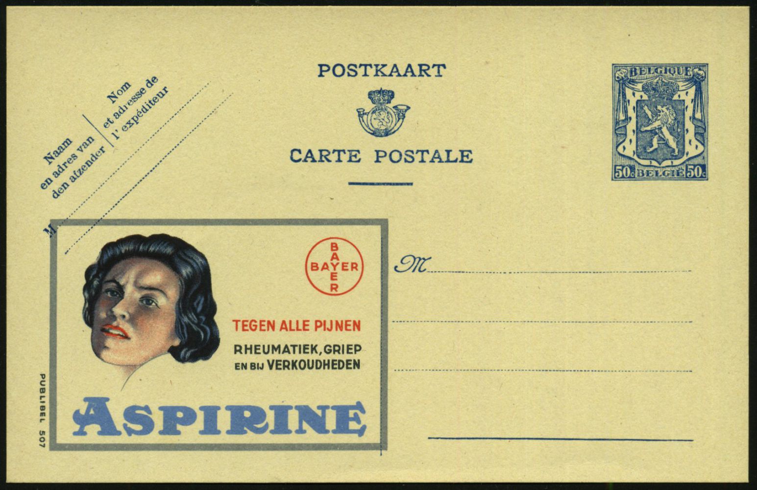 9483 | 18 € | 5090 LEVERKUSEN (Allgem. Abteilung, Sonder- und Maschinenstempel) : DEUTSCHE BES.BELGIEN 1941 50 C. Reklame-P. Wappenlöwe, blau: BAYER/CONTRE TOUTES DOULEURS/RHUMATISME, GRIPPE../ASPIRINE (Frauenkopf, Bayer-Logo) ungebr. (Mi.P 210 A I / 555) | ![]() | |