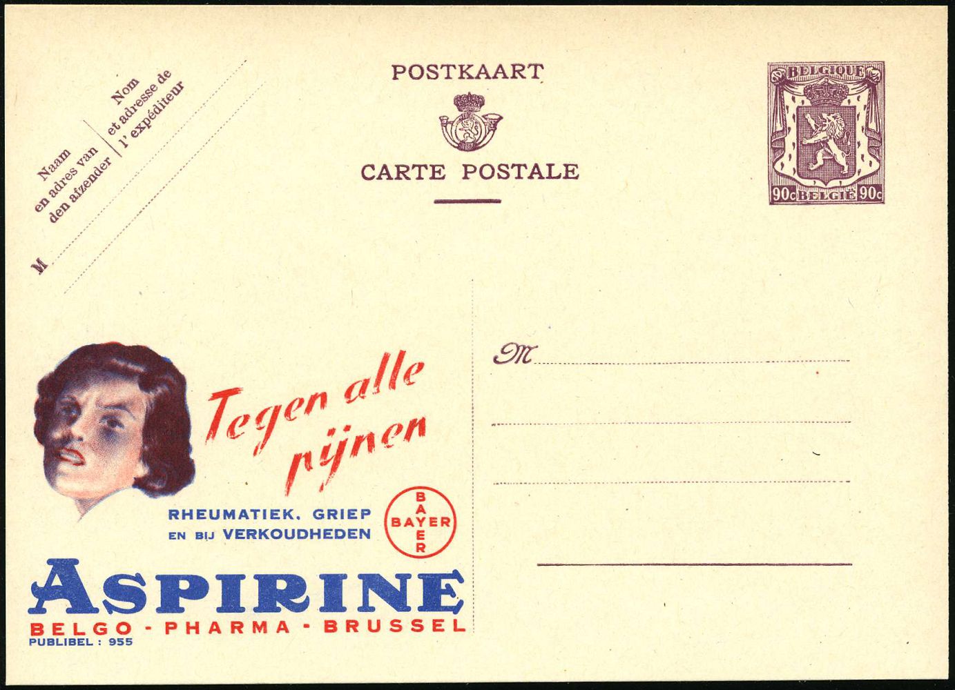 9487 | 16 € | 5090 LEVERKUSEN (Allgem. Abteilung, Sonder- und Maschinenstempel) : BELGIEN 1948 90 C. Reklame-P., Wappenlöwe, braunlila: Tegen alle pijnen/RHEUMATIEK, GRIEP..BAYER/ASPIRINE.. (Bayer-Logo u. schmerzverzerrter Frauenkopf) fläm. Text, ungebr. (Mi.P 248 II / 955) | ![]() | |