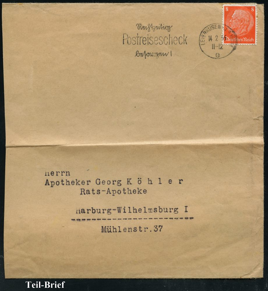 9456 | 25 € | 5090 LEVERKUSEN (Allgem. Abteilung, Sonder- und Maschinenstempel) : LEVERKUSEN-I.G.WERK/ e/ Rechtzeitig/ Postreisescheck/ besorgen! 1935 (14.2.) seltener Serien-MWSt, Text teils Sütterlin auf EF 8 Pf. Hindenbg. (kl. Zahnf.) klar gest. (links verkürzter) Inl.-Bf. (Mittelfalte) n. Harburg (Bo.S 111 A = Hauspostamt I.G.-Werk Bayer) | ![]() | |