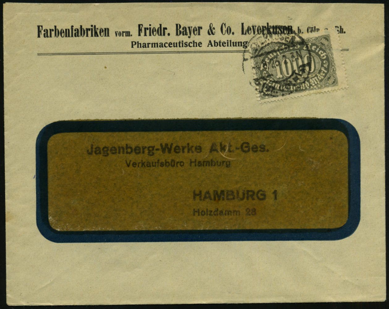 9454 | 20 € | 5090 LEVERKUSEN (Allgem. Abteilung, Sonder- und Maschinenstempel) : LEVERKUSEN/ *(KR CÖLN)* 1923 (4.8.) 1K-Brücke auf EF 1000 Mk., Firmen-Bf.: Farbenfabriken vorm. Friedr. Bayer & Co../ Pharmazeutische Abteilung , Infla-Fern-Bf.! (Mi.252 EF) | ![]() | |