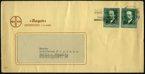 9459 | 35 € | 5090 LEVERKUSEN (Allgem. Abteilung, Sonder- und Maschinenstempel) : LEVERKUSEN-I.G.WERK/ e/ 2.KRIEGS-/ WHW 1941 (8.4.) seltener Serien-MWSt = Hauspostamt I.G.-Bayerwerk auf passenden 2x 6 + 4 Pf. Emil v. Behring (Mi.760 MeF) portorichtiger Inl.-Firmen-Bf.: "Bayer" I.G. WERK (Firmenlogo) seltene Kombination! (Bo.S 368 A) | ![]() | |