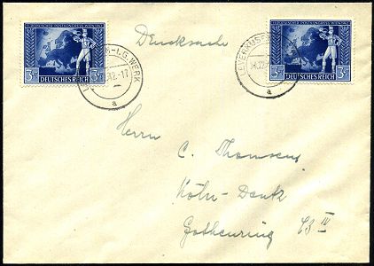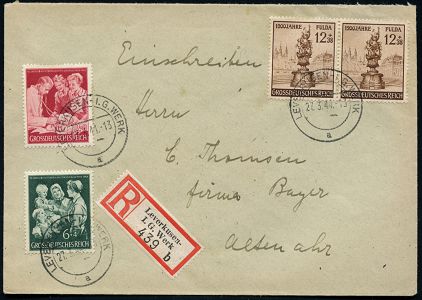 9461 | 35 € | 5090 LEVERKUSEN (Allgem. Abteilung, Sonder- und Maschinenstempel) : LEVERKUSEN-I.G.WERK/ a 1944 (27.3.) 2K-Steg = Hauspostamt I.G.-Bayerwerk 3x klar + Selbstbucher-RZ: Leverkusen-/ I.G. W e r k/ b , klar gest. Inl.-R-Bf. (Mi.870/1, 2x 886, + 7.- EUR) | ![]() | |