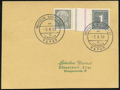 9464 | 28 € | 5090 LEVERKUSEN (Allgem. Abteilung, Sonder- und Maschinenstempel) : Leverkusen 1959 (5.8.) seltenes 2K-Bord-Postamt: DEUTSCHE SCHIFFSPOST/ao/TS/ "LEVERKUSEN"/HAPAG 2x klar auf Inl.-Drs.-Kt. = deutsches Handelsschiff "Leverkusen" ! (Seepost-Kat. Nr. i-29) | ![]() | |