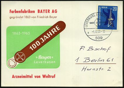 9466 | 16 € | 5090 LEVERKUSEN (Allgem. Abteilung, Sonder- und Maschinenstempel) : 509 LEVERKUSEN-BAYERWERK/ 1863 BAYER 1963/ a 1963 (1.8.) SSt = Hauspostamt mit Firmen-Logo , motivgl. Jubiläums-Reklame-Kt. n. West-Berlin (Bo.6 a) | ![]() | |