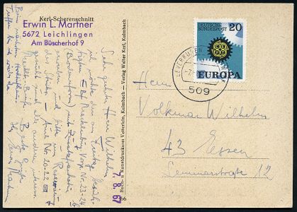 9467 | 14 € | 5090 LEVERKUSEN (Allgem. Abteilung, Sonder- und Maschinenstempel) : 509 LEVERKUSEN BAYERWERK/ b 1967 (7.8.) 1K-Segment = Hauspostamt Bayerwerk auf Bedarfs-Künstler-Ak. | ![]() ![]() | |