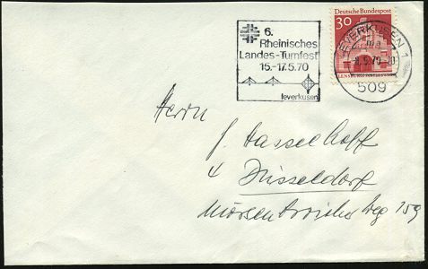 9469 | 12 € | 5090 LEVERKUSEN (Allgem. Abteilung, Sonder- und Maschinenstempel) : 509 LEVERKUSEN 1/ ma/ 6.Rheinisches/ Landes-Turnfest 1970 (8.5.) MWSt (Brücke u. "FFFF") klar gest. (gering verkürzter) Inl.-Bf. (Bo.17 A) | ![]() | |