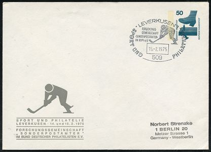 9470 | 15 € | 5090 LEVERKUSEN (Allgem. Abteilung, Sonder- und Maschinenstempel) : 509 LEVERKUSEN 1/ SPORT UND PHILATELIE 1975 (15.2.) SSt = Eishockey-Piktogramm , motivgl. PU 50 Pf. Unfall mit Eishockey-Piktogramm, klar gest. Inl.-Bf. (Mi.PU 65/20) | ![]() | |