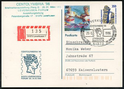 9479 | 18 € | 5090 LEVERKUSEN (Allgem. Abteilung, Sonder- und Maschinenstempel) : 51373 LEVERKUSEN 1/ CENTOLYMBRIA 96/ 100 JAHRE OLYMP.SPIELE/ ATHEN 1896.. 1996 (29.3.) SSt (Hermeskopf) auf 80 + 40 Pf. Kanusport (u.a.) + RZ: 51373 Leverkusen 1/i auf motivgl. Sonder-Kt.: "100 Jahre Olympia-Marken 1896" (1 Dr. Olympiastadion) codierte Inl.-R-Karte (Mi.1777 u.a.) | ![]() ![]() | |