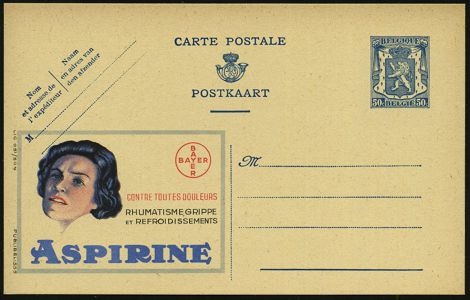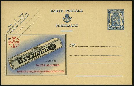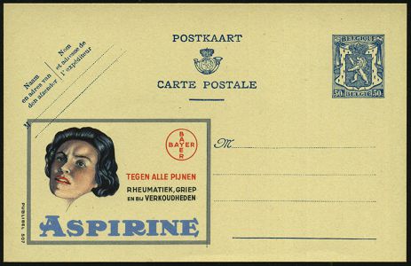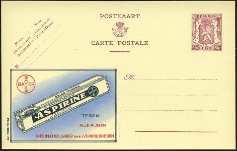 9485 | 16 € | 5090 LEVERKUSEN (Allgem. Abteilung, Sonder- und Maschinenstempel) : BELGIEN 1946 65 C. Reklame-P. Wappenlöwe, viol.: BAYER/ASPIRINE/CONTRE..RHUMATISME, GRIPPE.. (Aspirin) französ. Text, ungebr., Bayer mußte lt. Versailler Vertrag das Patent für Aspirin für die Länder der Siegermächte freigeben! (Mi.P 222 A I / 739) | ![]() | |