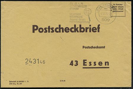 9472 | 15 € | 5090 LEVERKUSEN (Allgem. Abteilung, Sonder- und Maschinenstempel) : 509 LEVERKUSEN 1/ mc/ ..LEVERKUSEN/ FORUM/ DEUTSCH-/ BELGISCHE/ Jugend-Brief-/ markenausstellung 1976 (2.2.) MWSt (Lupe) auf portofreiem, gelben Postscheck-Bf. (PSch-Amt 43 Essen) seltene Verwendung! | ![]() | |