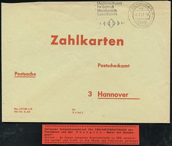 9474 | 18 € | 5090 LEVERKUSEN (Allgem. Abteilung, Sonder- und Maschinenstempel) : 509 LEVERKUSEN 1/ mc/ Moderne Kunst/ im Schloß/ Morsbroich.. 1977 (2.7.) MWSt auf Postscheck-Innnendienst-Bf.: Zahlkarten, Postscheckamt 3 Hannover (grün/ braun) für Zahlkartenaustausch !, seltene Verwendung! (Bo.28 A I, nur 1976-77 verwendet) | ![]() | |