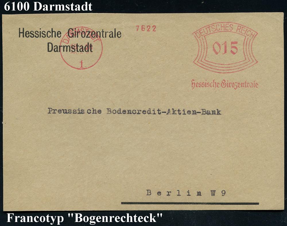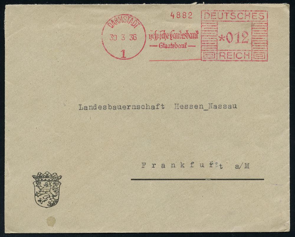1138 | 22 € | 6100 Darmstadt Absender-Freistempel : DAMSTADT/ 1/ Hessische Landesbank/ Staatsbank 1936 (30.3.) AFS Francotyp "Mäanderrechteck" auf Dienst-Bf. mit Landeswappen , die NS-Machthaber lösten am 31.3.1933 die Länder auf = Gleichschaltung u. Entmachtung der Länder, Fern-Bf. (Dü.E-2Ah) | ![]() | |